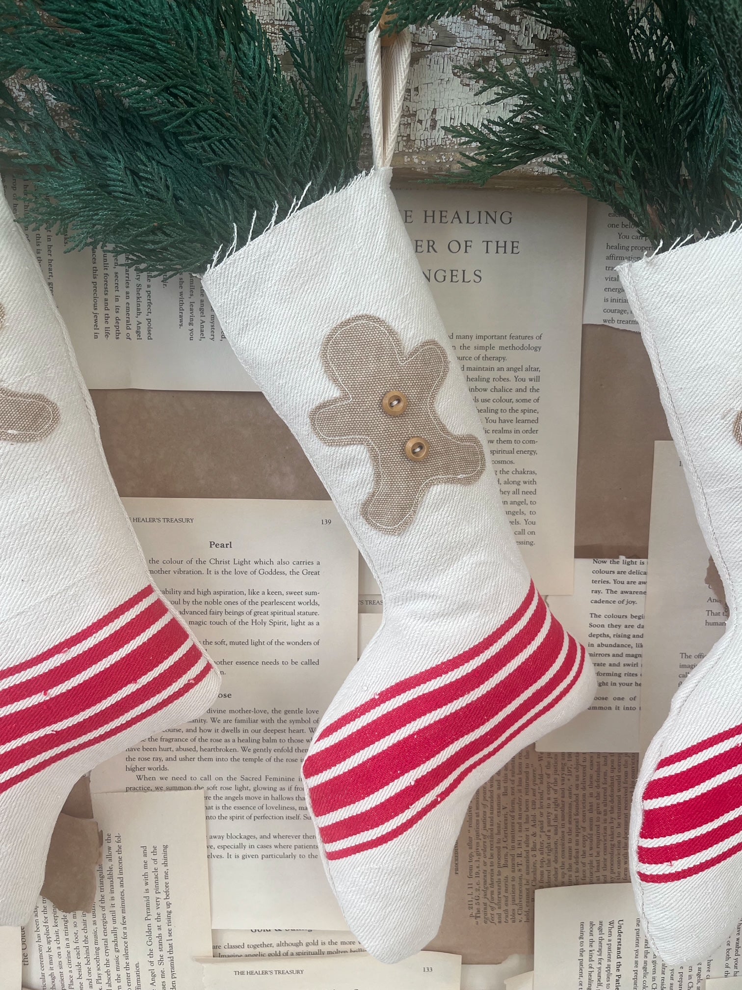 Gingerbread stocking made from a red striped vintage grain sack. Stocking is stuffed and filled with beautiful preserved cedar branches.