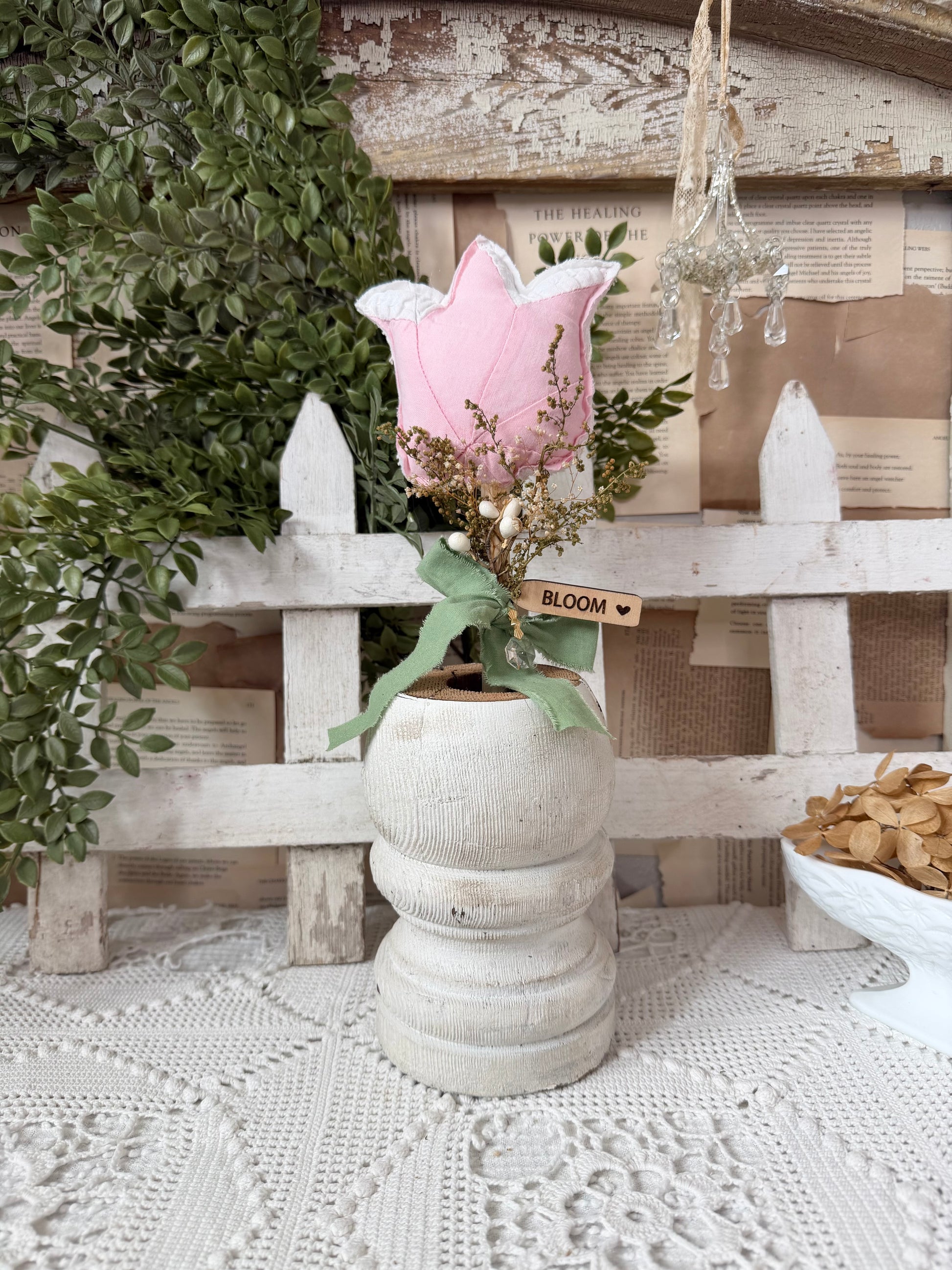 Decorative tulip made from a vintage quilt and decorated with a bow and dried florals.